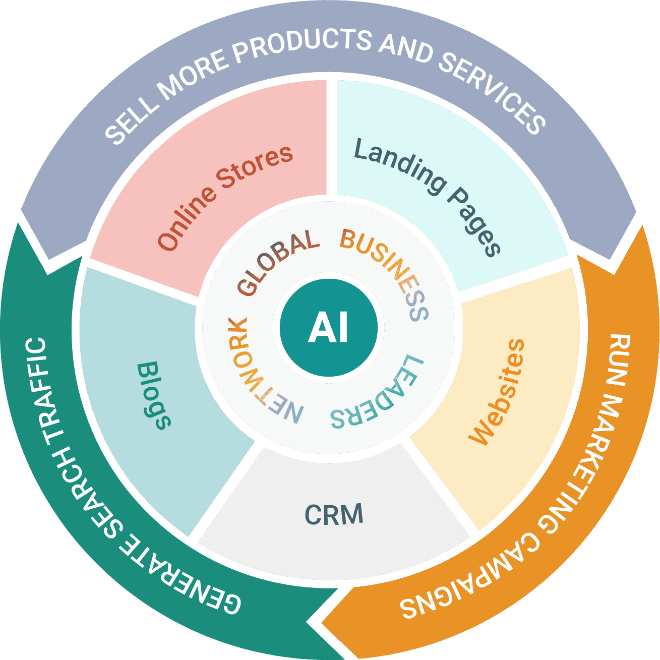 Sell More Products and Services Online Stores Landing Pages Websites Run Marketing Campaigns CRM Generate Search Traffic Blogs Artificial Intelligence Global Business Leaders Network